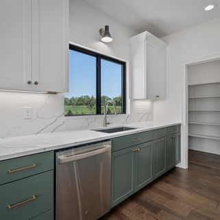 This home is a custom version of our Cypress model, designed by the Forrest Homes Team. This home was designed with a custom stone fireplace with double sliding glass doors that opens onto the screened in deck. The green lower Kitchen cabinets offer a statement to this kitchen along with the full quartz backsplash.